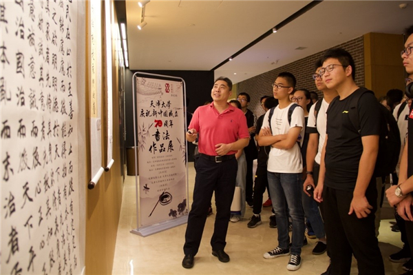 在嘉宾致辞结束后,刘秀国宣布“天津大学庆祝新中国成立70周年书法展”开幕。随后,刘秀国带领同学们参观作品,并为同学们点评每幅作品的内容、风格、特点,给同学们带来了一场生动的现场教学课。本次开幕式圆满结束。