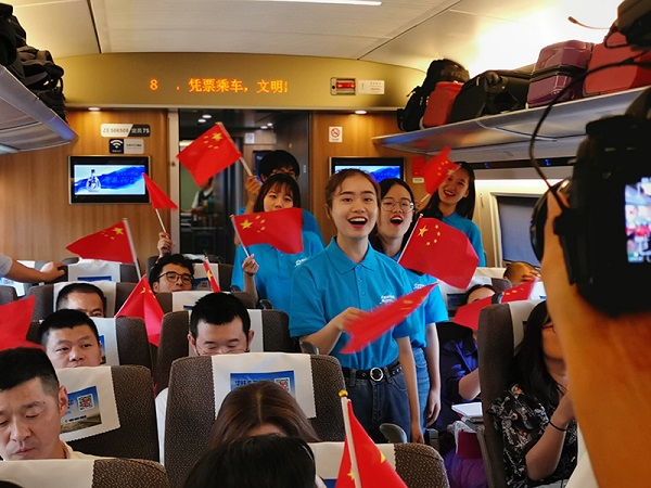 化工学院2019级硕士生卞雪珂说:这次活动震撼了我,来自五湖四海的青年人高唱对祖国的热爱,我的内心也燃烧着熊熊爱国情。在高铁上放歌,我们与乘客们一同挥舞国旗的经历,我感受到了人民群众的力量。参观一大会址,我了解到了党的成长之路,从此会议后,中国的革命面貌焕然一新。除此之外,我更感受到了天大人富有活力的一面,我们将继续努力,为祖国贡献力量。