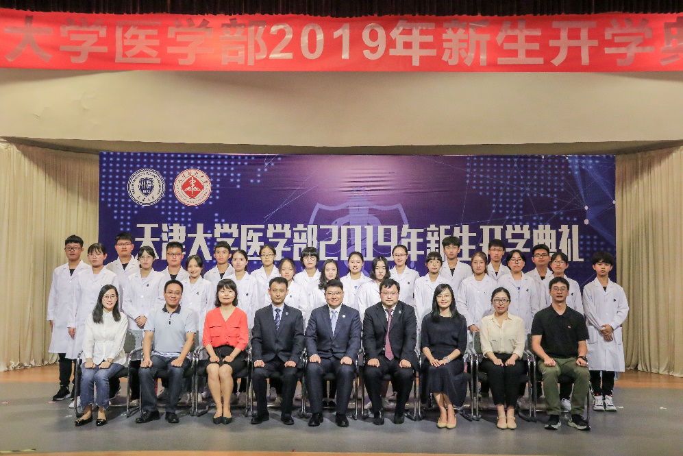 天津市卫生健康委员会科教处处长高辉,中国工程院院士、天津大学医学部主任顾晓松,天津大学党委副书记、组织部长、统战部长赵美蓉,天津医科大学副校长于春水,天津天堰科技股份有限公司董事长刘霄飞,天津大学六家附属医院相关负责领导,天津医科大学教务处、生物医学工程与技术学院,以及天津大学医科建设办公室、医学部负责同志出席开学典礼,共同迎接来自天津大学医学部、天津医科大学生物医学工程与技术学院共200余名2019级新生。