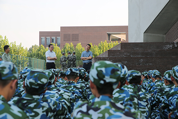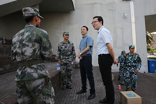 本站讯(通讯员 李莎)9月3日,化工学院党委书记赵金铎、党委副书记高旭东赴田径场看望大二军训学生,2018级辅导员董严斌、赖伊璠陪同。