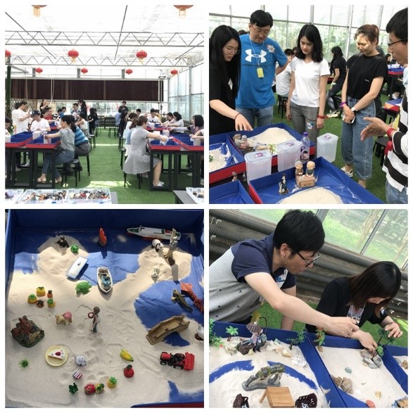 在团体沙盘环节,青年教职工伴随着灵动舒缓的音乐,将自己对生活的感知和对未来的憧憬融入其中,创作出各自的“心世界”,并分享了创作感受,进一步增进了交流。