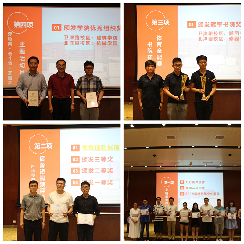 接下来,颁奖嘉宾分别为劳动主题教育活动月优秀组织奖、“书院杯”冠军书院、宿舍短视频获奖宿舍以及2019年文明宿舍进行了颁奖。