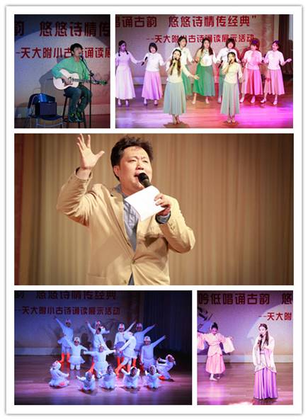 活动期间,天大幼儿园的小朋友们也带着舞蹈《咏鹅》、《敕勒歌》为这场诵读活动添上生动的一笔,整齐的队形,灵动的表情,他们的脸上写满了对校园及国学文化的渴求与憧憬。被称为天津民谣三杰之一的许德樑老师为大家现场吉他弹唱,令在场观众耳目一新。他潜心于将中国古典诗词谱写成民谣歌曲,迄今已有原创古诗词音乐作品50余首。来自附小的张慧老师将诗情赋成曲调,一曲《墨梅》、《知否知否》,中华的千年古韵在观众的耳边久久回荡。附小九位青年教师寄情于诗词,时而柔美、时而高亢,句句情深。天津广播电视台音乐广播节目部主任,十佳节目编辑、主持人欧阳老师也受邀参加了本次活动。一首李白的《将进酒》,豪纵狂放,奔涌迸发如江河流泻,感染着在场的每一位观众。