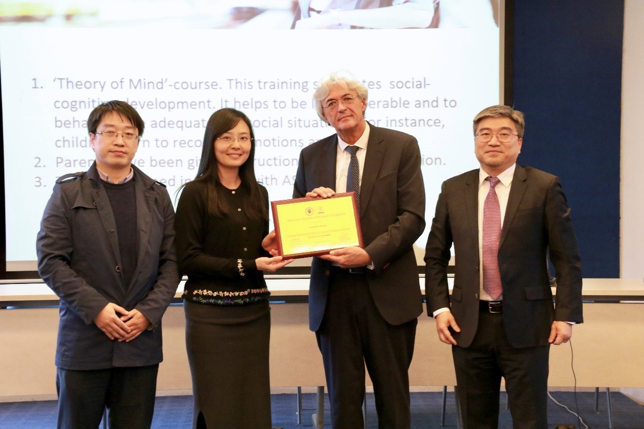 荷兰精神康复医学专家Jan Hindrik Loonstra教授以一名男孩的成长经历为例,做了“Searching happiness by social connection”为主题的报告,向在场师生讲述了社交对人获得幸福感的重要性,以及孤独症谱系障碍患者治疗的系统方法。他表示,可通过患儿、家长和老师三方面的共同努力,从而帮助孤独症谱系障碍患者获得更加幸福的人生。