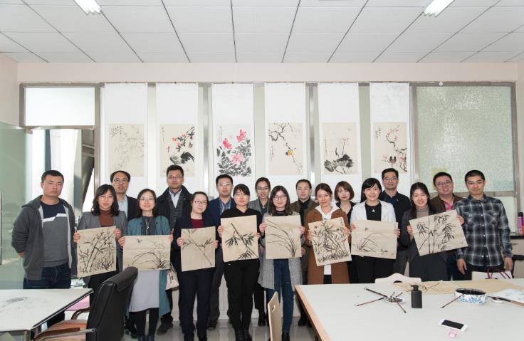 随后,由前沿技术研究院美术指导丰硕老师为党员们讲解中国国画历史,并对《潇湘奇观图》《瑞鹤图》《渔父图轴》《墨竹图》等四幅作品从笔墨、构图和造型上进行讲解,组织大家前往画室,共同学习墨竹的画法。