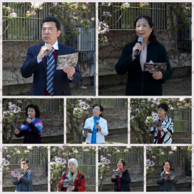 一直以来,海棠花都是天津大学与大自然间的信使,是北洋人近在咫尺和远在他乡的惦念。海棠花开似锦,淡雅高洁,美艳无双,自古以来是文人墨客争相吟诵的对象。在这次海棠诗会中,离退休工作处特别邀请到北洋老年大学朗诵一班的老同志和朗诵一班的授课教师,天津广播电台主任播音卢长瑞老师,与青年教师和青年学生一起在海棠树下诵读了二十余首海棠有关的诗词,或慷慨激昂,或低吟浅诵,在诗意中体会海棠花“虽艳无俗姿,太皇真富贵”的高雅,体会“猩红鹦绿极天巧,叠萼重跗眩朝日”的鲜艳。