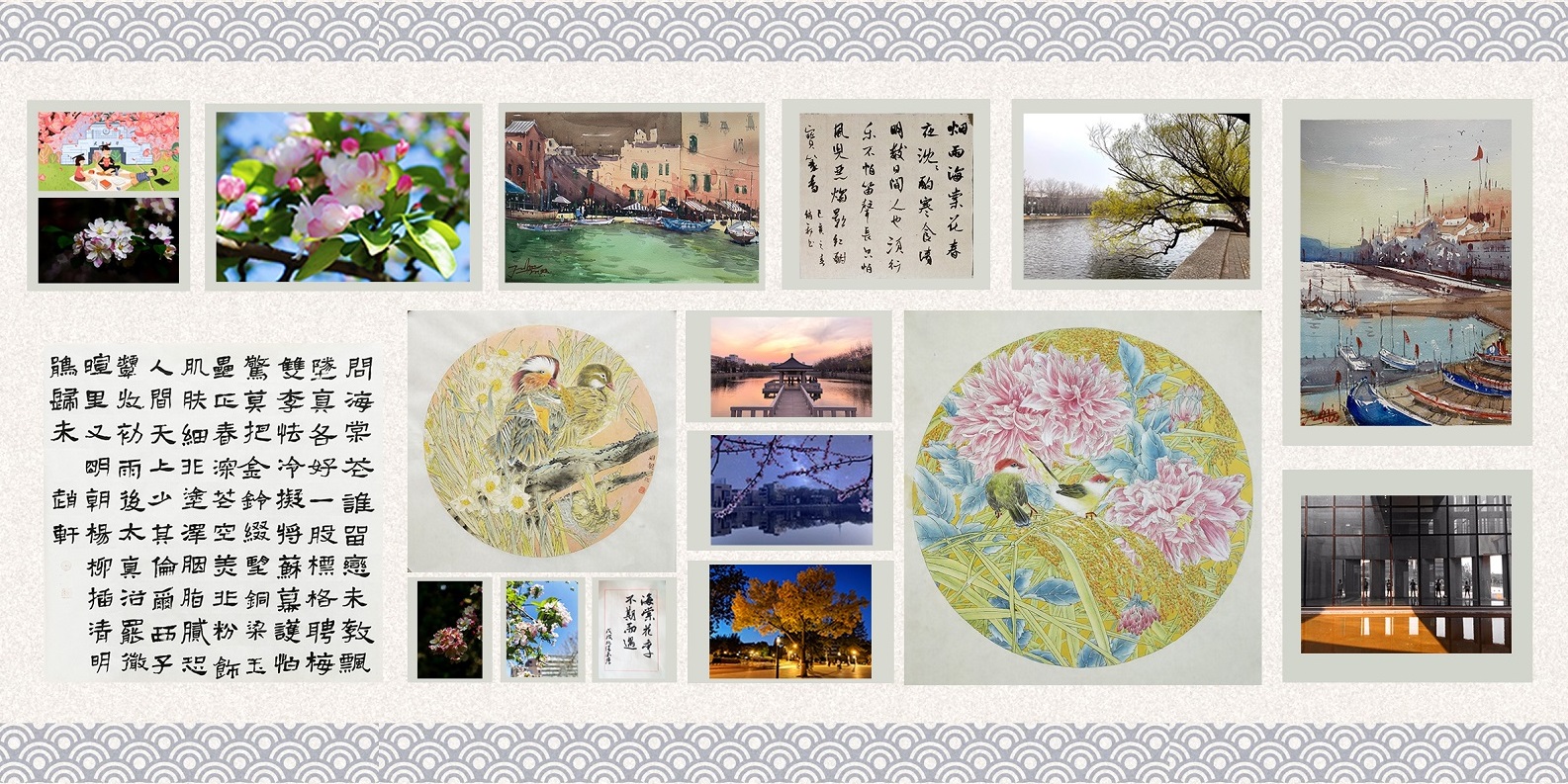身为天大学子,我们与这个春天许下约定:用所学、释海棠,营造兼具艺术特色的学术氛围。风景园林专业、设计学和艺术专业的张颖、刘也、刘怡廷、彭彤彤、张纬玉、张梓乔、伊日贵等同学们运用摄影、视频等方式,以敏锐独特的艺术视角捕捉天大春日温暖惬意的美好。美术学专业的朱雅靓、赵轩、郭子熙、刘仲林、朱晓明等同学们则发挥其专业所长,运用工笔画、书法、水彩画等方式将天大无限的春意尽现于方寸绢素之间。
