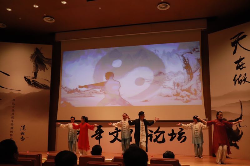 在讲座开始前,几位太极大师为观众进行了一场太极拳表演,大师的精彩演绎与极具古典风情的音乐相配,深深吸引了现场的观众,将观众带入了武侠的气氛中。