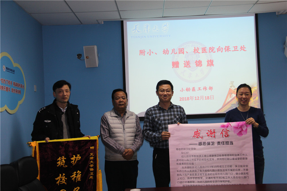 本站讯 (通讯员 王曌)为感谢校保卫处多年来对小幼医安全工作的大力支持,12月18日下午附小、幼儿园、校医院集体向保卫处赠送锦旗,谨此向一直以来重视小幼医安全稳定工作的保卫处领导及全体工作人员致以衷心地感谢。