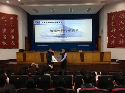 在义乌中学和衢州第二中学,刘琨分别面向400余名高一学生和100余名高三学生及家长作了题为《智能光纤传感技术》的科普报告。他首先介绍了国内外传感器与人工智能的发展历程,指出人工智能是开启未来智能世界的密钥,传感器技术的发展是人工智能的技术基础,多传感器融合技术的发展将是未来人工智能发展的突破口。他通过列举光纤传感器智能网络在智能交通、智能管网、智能电网以及“一带一路”开启的新兴基础建设市场领域的重要应用,表明光纤传感可通过实现海量监测信息的获取从而用于人工智能分析的重大意义。他具体讲述了基于传感网的盾构智能自动拼装系统,其基于多传感器融合技术,利用人工智能算法提取特征信息、解算目标位姿、规划运动轨迹,最终实现管片自动拼接的功能。最后,他详细介绍了浙江的大类专业设置、选考科目设置和往年录取分数情况,展示了2018届天津大学浙江籍考生的学生发展情况,并鼓励大家积极报考天津大学。