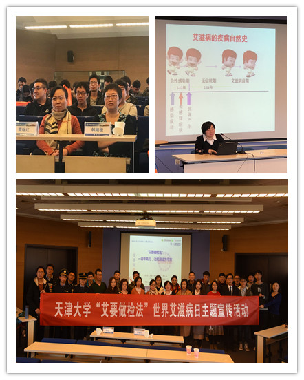 本站讯(通讯员 刘萍)为进一步推动艾滋病防治工作,全面落实国务院防治艾滋病工作委员会办公室关于做好2018年“世界艾滋病日”宣传活动的通知精神,12月1日,天津大学学工部、后勤保障部、南开区疾控中心联合主办,天津大学红十字会、同伴教育社承办的“艾要做检法——青年先行,让检测成为平常”为主题的世界艾滋病日宣传讲座在卫津路校区顺利开展。天津市药具管理中心为此次活动的开展也提供了大力支持。天津市计划生育协会副秘书长曹继红、天津大学后勤保障部党委副书记韩婧极与在座师生一起聆听了讲座。讲座开始前,同学们展现出极大的热情,纷纷在留言板上写下了“防艾”寄语,活动就此拉开序幕。