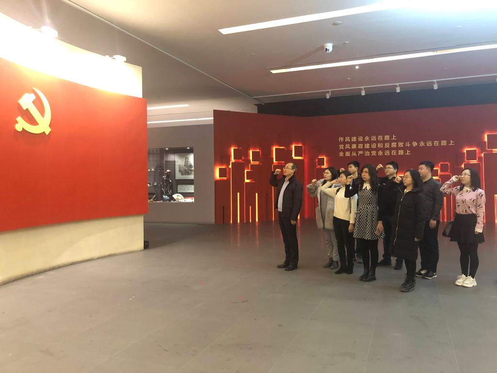 大家在讲解员的引导下有序参观,一段段忏悔的视频、一句句警醒的话语、一个个鲜活的案例,让全体教师驻足沉思,心灵也收到强烈震撼。大家认真聆听讲解,仔细观看案例展示及文字剖析,不时驻足深思,接受警示教育。参观最后,支部书记吴迎新带领大家面向党旗重温入党誓词。