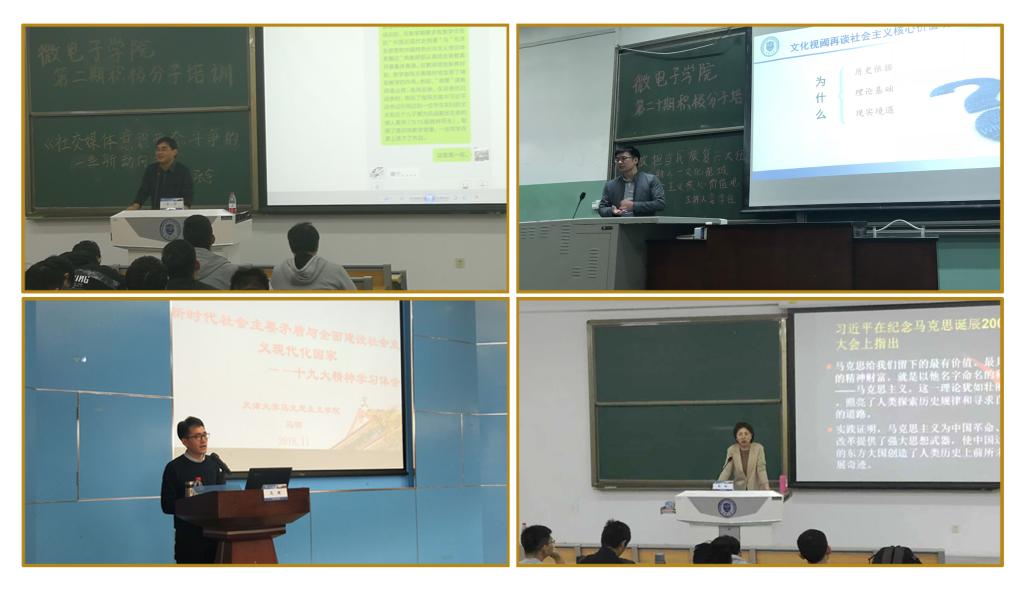 11月3日上午,张宇作了题为《社交媒体意识形态斗争的一些新动向》的专题报告,通过分析各种社交网站、网络社区和论坛等社交媒体的开放性、互动性等特点,揭示了社交媒体对于意识形态传播的巨大影响,引导各位学生党员正确对待社交媒体上的舆论,避免盲从;11月4日下午,栾淳钰做了题为《争做担当民族复兴大任的时代新人》的专题报告,从文化视域深入剖析社会主义核心价值观,强调学生党员要积极弘扬社会主义核心价值观,担负起民族复兴的重任,坚定文化自信,争做时代新人;11月11日上午,马明做了题为《新时代社会主要矛盾和全面建设社会主义现代化强国》的专题报告,从新时代社会主要矛盾的变化深入剖析新时代中国特色社会主义思想,明确党和国家在新时代全面建设社会主义现代化强国的政策方针,鼓励大家要坚定社会主义道路,坚信共产党的领导,在习近平新时代中国特色社会主义思想的指导下,担负起建设社会主义现代化强国的重任;11月11日下午,张畅做了题为《改革开放是决定中国当代命运的关键决策》的专题报告,回顾了改革开放以来社会发生的巨大变化以及党和国家取得的伟大成就,深入解读改革开放的正确性与关键性,帮助各位学生党员深刻理解改革开放对于中国的重要意义。