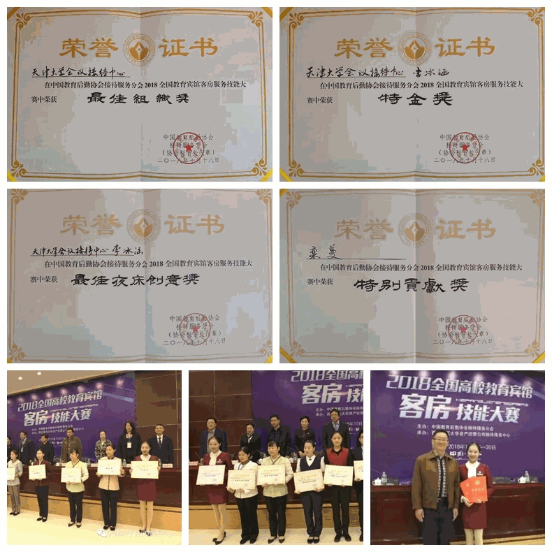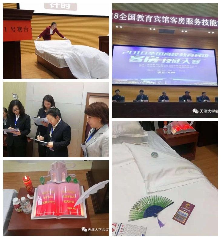 比赛经过一整天的激烈角逐,选手们通过仪容仪表、口答试题、标准中式铺床、开夜床等4项内容的比拼,天津大学会议接待中心代表队最终获得“特金奖”、“最佳夜床创意奖”、“特别贡献奖”、“最佳组织奖”等4项殊荣。