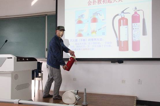 建筑工程学院副院长王葳、副院长蒋明镜,学院安全管理员,各实验中心主任,实验室负责人,新入职教师,研究生工作室安全员近70人参加了培训。王葳着重阐述了安全生产的重要性,消防培训的必要性,9:10分安全培训正式开。首先,弓科长给各位师生介绍了火灾的概念和危害性,并讲述了近几年在天大发生的各种消防火灾案例,并展示了大量的火灾后的图片,在场师生听的唏嘘不已,连连感叹“大火无情,火灾猛于虎”。随后,弓保津为大家讲解了“防火的基本措施”,“火灾的预防措施”,“火灾扑救方法”灭火器的正确使用方法,“逃生方法”如火灾发生时不要坐电梯,火灾逃生时要用湿毛巾捂住口鼻弯腰前行,大火一旦蔓延3层到3层以上的人员不要轻易跳楼逃生等,以及“正确报火警的方法”。在整个培训过程中弓科多次强调“生命高于一切,消防责任重于泰山”。