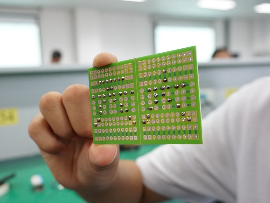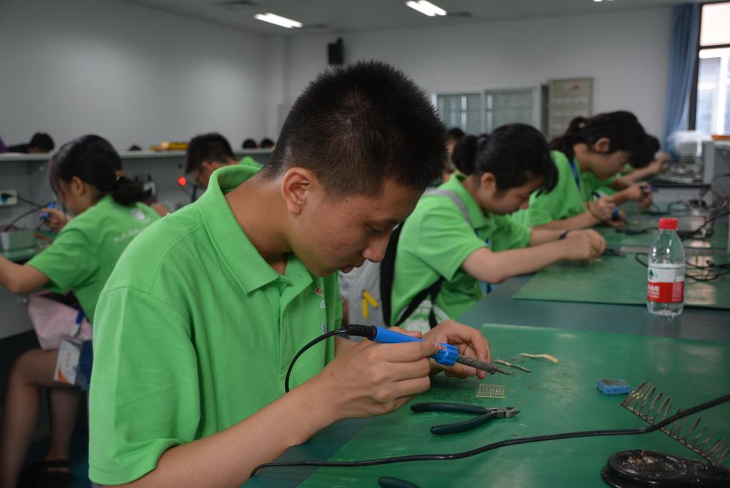 上午9时许,营员在小班带领下走进48楼电工电子实验教室,在实验老师的专业指导下体验焊接技术的操作。在实践过程中,几位实验老师持续检查营员们的操作是否安全规范,并为同学们答疑解惑。小班也贴心地帮助指导完成较为困难的实验操作。由于之前的高中生活中更注重理论知识的学习,所以这一次珍贵的动手操作机会对于营员们来讲十分新鲜与有趣。营员们表现出极大的热情,完成了众多极具创新性与趣味性的焊接作品。