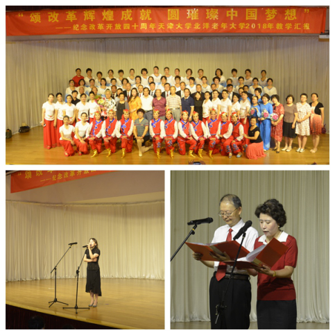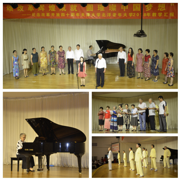 2016年12月份,天津大学北洋老年大学正式成立,目前已开设14门课程,共计26个教学班,累计1200余名老同志加入老年大学。老同志学员们怀抱着终身学习的理念和满腔热情投身到老年大学的学习中,在丰富自身精神文化生活的同时,积极为党和人民的事业增添正能量。在这场汇报演出中,老同志学员们有的虽已白发苍苍、年逾花甲,却有着一份高涨热情,不顾酷暑高温,认真参与筹备与排练,凭着一股“活到老,学到老”的劲头与热情,最终精心为我们呈现出一场有声有色的完整演出。