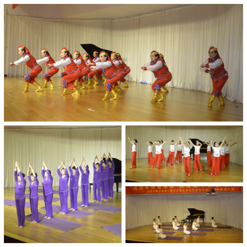 民族舞初级班、民族芭蕾形体舞蹈初级班、民族舞提高班等6个教学班的学员为大家带来了《烟花三月下扬州》、《红梅花儿开》、《梨花颂》、《梅花泪》、《康美之恋》、《骏马奔驰》等舞蹈,老师们的舞姿优美大方、生动活泼、绚丽多姿,展现了天津大学离退休老师们的卓绝风姿和青春活力,将全场的气氛烘托得极为热烈。瑜伽初级班的学员为我们带来了舞韵瑜伽《菩萨蛮》、《爱的传说》,老师们优雅的气质、轻盈的体态引得现场观众不断称赞。