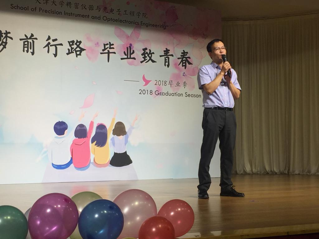 本站讯(通讯员 单亦鹏)6月21日下午6时,精仪学院“逐梦前行路,毕业致青春”2018届本科生毕业晚会在卫津路校区大学生活动中心一层报告厅举行。精仪学院党委书记王海龙,党委副书记张宇,光电子科学技术系副主任刘博文、教授胡明列,生物医学工程与科学仪器系副主任余辉、何峰,学院党委学工办全体辅导员与2018届全体本科毕业生共同度过了这个温馨难忘的夜晚。