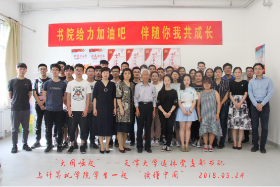 本站讯(通讯员 王小轩)5月24日,由天津大学离退休工作处和计算机科学与技术学院共同主办的纪念改革开放40周年活动之“大国崛起”——天津大学退休党支部书记与计算机学院学生一起“读懂中国”的主题讲座,在天津大学北洋园校区诚园八斋A座130室书院读书角举办。天津大学计算机学院退休党支部书记、关工委主任、天津大学关心下一代委员会理论组成员任长明教授,机械学院退休党支部书记贾启芬教授受邀出席,与计算机学院“新英才计划”骨干训练班的31名学生一起“读懂中国”。天津大学计算机学院党委副书记赵娜、天津大学离退休工作处处长助理张维、天津大学离退休工作处王小轩,计算机科学与技术学院辅导员谢华哲及相关工作人员参加活动。
