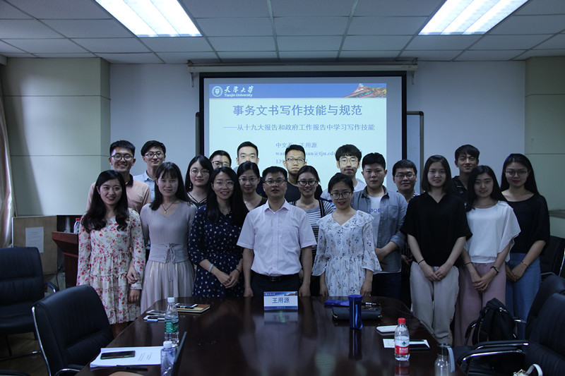 为进一步深入学习贯彻习近平新时代中国特色社会主义思想,并提升学员公文写作时的政治素质,本次“含英学‘习’”环节邀请到了天津大学外国语言与文学学院党委委员、中文系副主任王用源老师。王用源以十九大报告和政府工作报告为蓝本,为学员们讲解了工作计划和年度总结的行文方法,从标题、前言的写法讲到了选词、用词的搭配,通过横向对比历年报告分析了渐进式的表述,最后利用多个案例仔细梳理了编写计划和总结的重点难点。