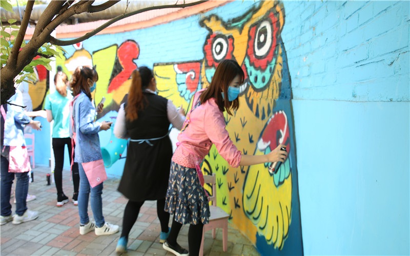 青年教师利用业余时间对园所内南侧围墙进行彩色绘画,美术创意老师乔瑀创作设计了整体的绘画方案,35名青年教师互相配合,一起动手进行喷涂描摹。青年教师们用智慧才华和无私奉献精神书写着心中的梦想。