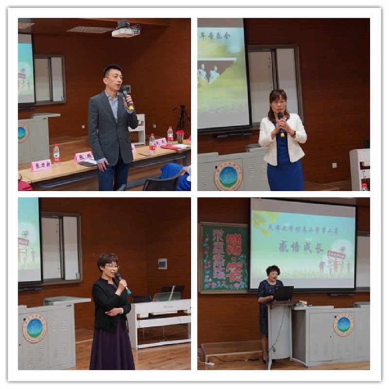 本站讯(通讯员 郑焱琼)为加强教师队伍建设,提升学校教育教学质量,规范学校管理,4月24日,天大附小于电化教室全向全体教师召开“感悟·成长——青年教师论坛”,活动由周迎老师主持,天津大学校长助理张力新、天津大学人事处副处长张鹏、小幼医党委总书记赵翠云、副书记刘津受邀出席了此次活动。老师们声情并茂的演讲、全情投入的表演让现场的气氛活跃、热烈。
