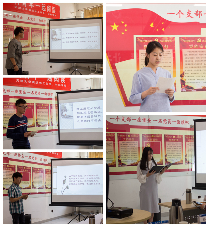 本站讯(通讯员 王小轩)4月20日,天津大学离退休教职工2018年读书周系列活动之“毛主席诗词诵读会”在诚园8斋书院125活动室成功举办。本次读书分享活动由天津大学离退休工作处与材料学院团委办公室联合举办,由部分退休老同志与青年学生共同诵读毛主席诗词,在主席诗词中学习革命传统,弘扬革命精神,树立文化自信,发扬良好作风。天津大学离退休工作处副处长王岩妍,处长助理张维,材料学院党委副书记王莹,出席了此次活动。