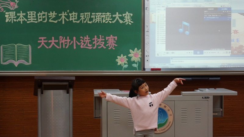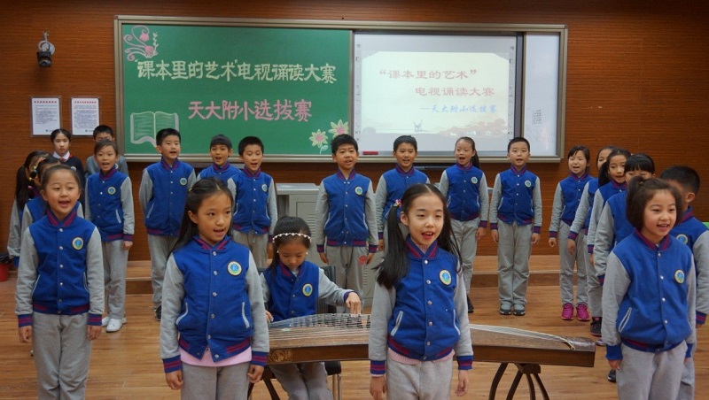 本站讯(通讯员 杜承倩 宋雪)为深入贯彻党的十八届三中全会精神,丰富学生文化生活,展现少年儿童文明健康的精神风貌,天津大学附属小学响应天津市广播电视局的号召,提高学生对文本艺术的鉴赏能力,于11月15日举办“课本里的艺术”诵读比赛。天津电视台少儿频道、学校相关部门负责人和教师代表担任大赛评委。