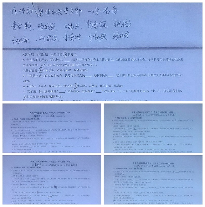 本站讯(通讯员 王小轩)中国共产党第十九次全国代表大会是在全面建成小康社会决胜阶段、中国特色社会主义进入新时代的关键时期召开的一次十分重要的大会,也是党领导人民开启全面建设中国特色社会主义国家新征程的一次大会。认真学习、深入领会、大力宣传、全面贯彻党的十九大精神,是当前和今后一个时期的首要政治任务。为进一步完成这一重要任务,天津大学离退休工作处举办离退休教职工“十九大”知识竞赛答题活动,深入学习贯彻落实党的十九大精神。
