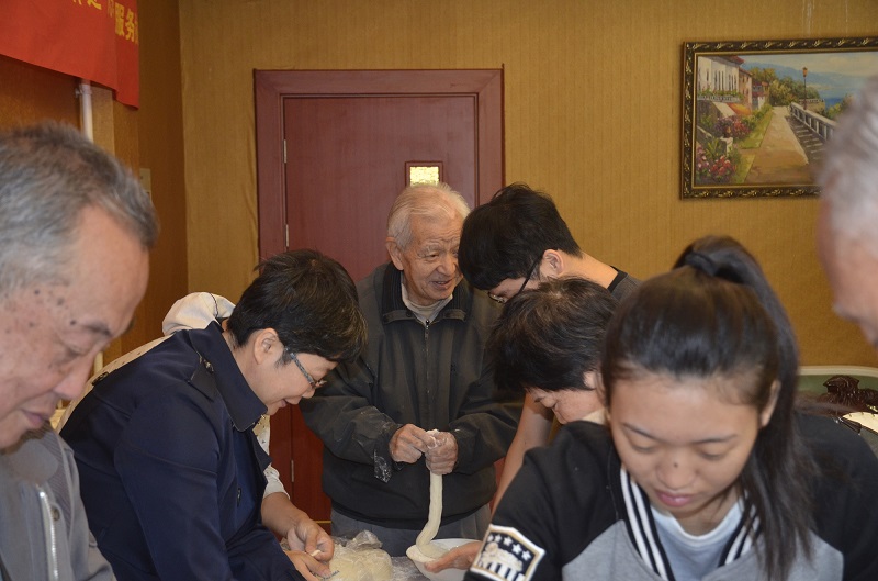 包饺子的过程中,老同志们兴致勃发,亲自动手擀皮、包馅,与青年学生共话家常、询问他们的学习生活情况,并不时指点包饺子的动作要领。