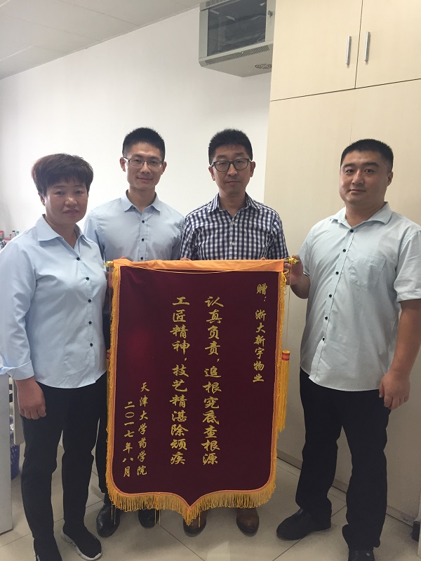 药学院老师非常感谢物业工作人员,实验室的多年顽疾在物业的努力下终于得到了解决,并特意叮嘱身边工作人员要为物业送面锦旗表示感谢。锦旗既是对物业工作的肯定,也是对物业人的激励和鞭策。“认真负责,追根究底查根源;工匠精神,技艺精湛除顽疾”简单的22个字,体现了全体物业人员“为了您的满意,我们全心全意”的服务宗旨。