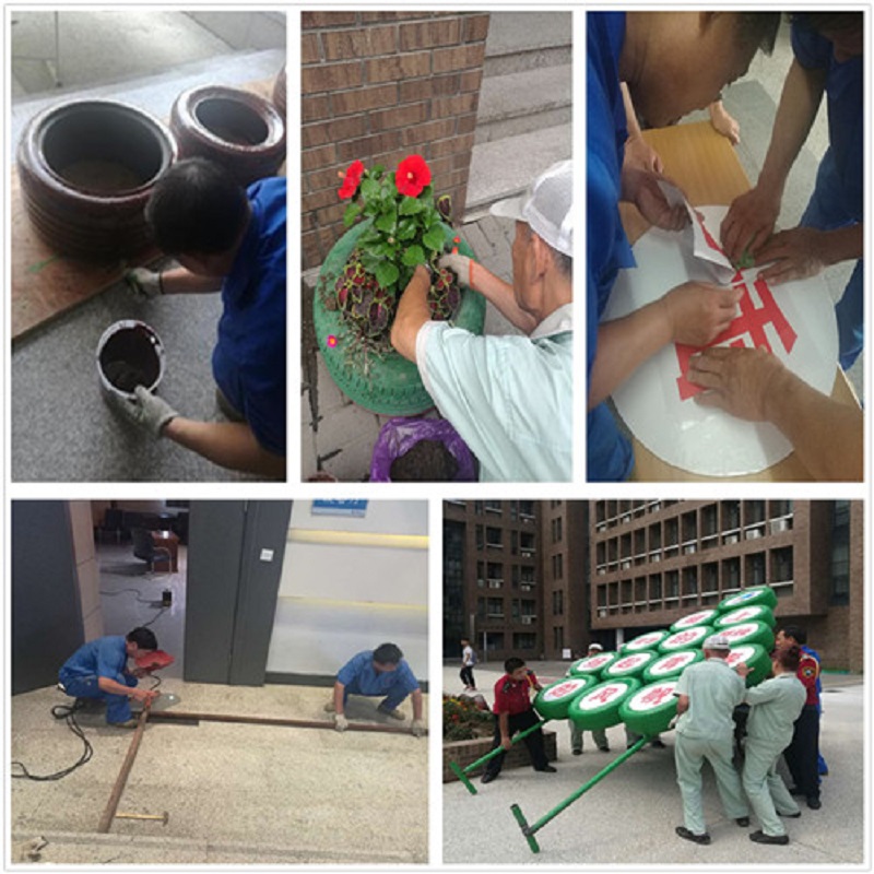 物业方面从7月中旬开始制定计划,首先选购了一批大小、厚度相近的废旧轮胎,集中对其进行除尘、刷漆,然后选定在26教学楼A、B、C区墙边进行摆放、填土,同时栽种紫叶草、太阳花、牡丹花、五瓣莲等成活率高、颜色鲜艳的花卉,并由专业人员对花卉进行浇水和精细化管养。为了营造积极向上的校园文化,美化校园环境,物业方面开拓思路,结合自身岗位专业优势,利用木板和轮胎设计、焊接了一个大型展牌,树立在C区前广场大松树旁。