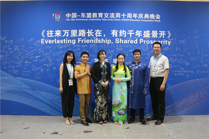 本站讯(通讯员 许宪硕)日前,以“十年教育同携手 一带一路谱新篇”为主题的中国-东盟教育交流周十周年庆典晚会在贵州省贵阳市贵州师范大学礼堂拉开帷幕。中国和东盟十国的留学生倾情演绎,共同呈现出一场既彰显各国民族特色,又体现团结合作、携手共进的文艺盛宴。天津大学国际教育学院马来西亚留学生娄缃旖、柬埔寨留学生柬弘信和越南留学生范玉雪,携手广西艺术学院越南留学生、天津师范大学泰国留学生,融合诗歌朗诵、笛子演奏和书法表演共同演绎《中国-东盟:我们的美好未来》。