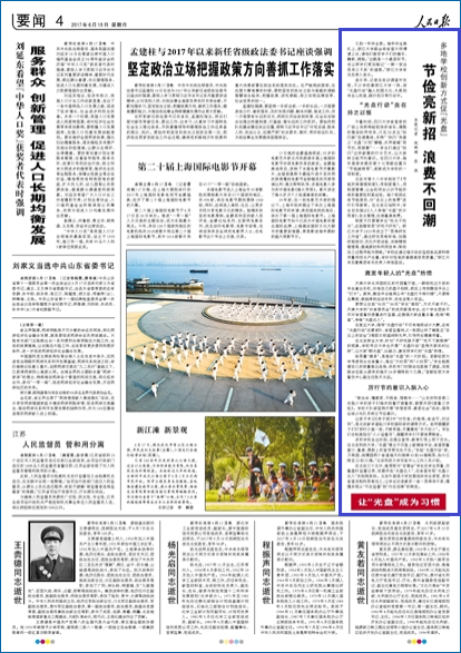 连日来,记者在走访调查中发现,不少学校像浙江大学一样,将“光盘行动”融入校园文化,扎根到学生心坎里,践行到日常行动中。