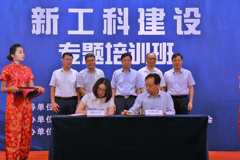 本站讯(通讯员张寿行 摄影董健)2017年7月29日,“新工科建设专题培训班”在天津大学举办。开班仪式上,天津大学与腾讯科技(深圳)有限公司(以下简称“腾讯公司”)签署新工科建设合作备忘录。天津大学也成为继教育部与腾讯公司在4月份签署新工科全面合作备忘录之后,首个签署合作备忘录的高校。教育部高等教育司司长吴岩,天津大学党委书记李家俊,中国工程院院士、天津大学校长钟登华,中国工程院院士、中国人工智能学会理事长李德毅,天津市教委副主任邢立华,教育部高等教育司理工处处长吴爱华等出席签约仪式。