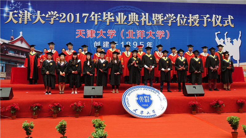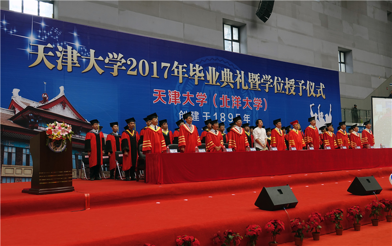 伴随着热烈的掌声,校领导和来宾依次走上主席台落座,典礼在庄严雄壮的国歌声中拉开帷幕。天津大学2017届本科毕业生总计3995名,经天津大学学位评定委员会审议,其中3868名学生获得学士学位。