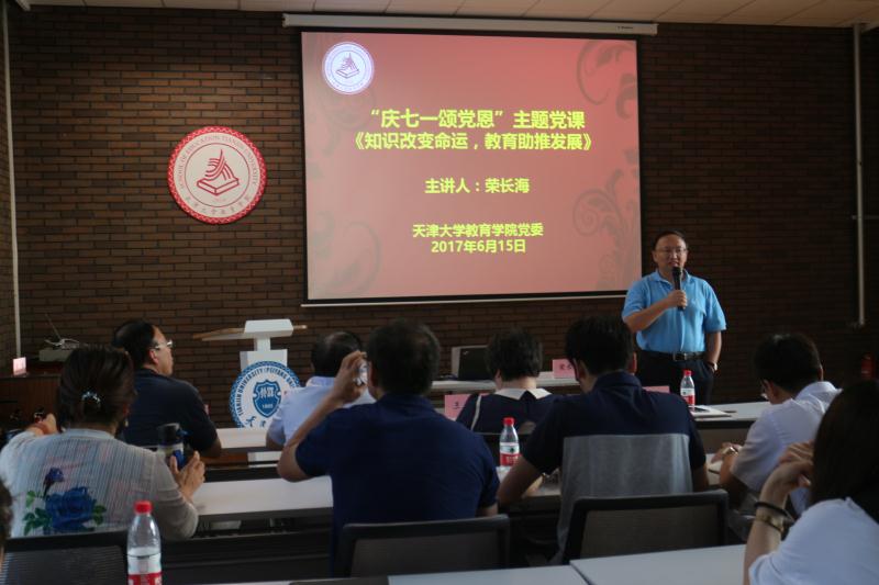 本站讯(通讯员 刘梦茹)6月15日下午,天津市教育科学研究院党委书记、教授、博士生导师荣长海教授在天津大学教育学院127多功能厅为师生讲授党课,党课主题为:知识改变中国,教育助推发展。教育学院党委书记王世斌,马克思主义学院党委副书记王春艳,教育学院党委副书记刘东海,教育学院副院长朱健,教育学院副院长孙克俐出席,此外,还有天津大学机关党委的老师,天津大学“三强班”学员,马列学院和教育学院的老师同学们共计百余人参加了此次党课。