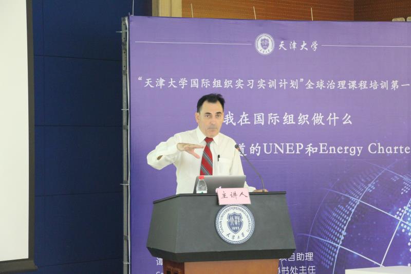 原能源宪章秘书处主任Steivan Defilla、联合国环境规划署项目经理谭迪文、全球能源互联网发展合作组织专员尹博以及APEC可持续能源中心专员秦冬为同学们带来了实习实训计划课程培训第一讲:“我在国际组织做什么,走进你不知道的UNEP和Energy Charter”。几位主讲人从多个角度介绍了国际组织当前的发展现状,什么是国际组织,国际组织的工作内容是什么,以及其对人才的素质要求。