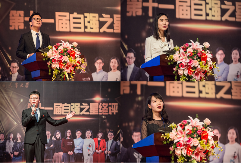 终评现场充满温馨和感动,候选人的优秀事迹和自强不息的励志精神感染这到场的每一位师生。各位候选人在5分钟展示中各显其能,全面地展示了品学兼优的个人事迹和坚强不屈的精神。每位候选人虽然经历不同,各有特点,但是他们百折不挠、自立自强的优秀事迹无不让在场师生动容,眼中包含感动的泪水。他们从各个方面诠释了“天行健,君子以自强不息”的含义。最终,综合场外投票和现场投票结果,机械学院赵云龙、建工学院王永涛、化工学院李凯、王亚男、材料学院李明珠、谢思雨、经管学部张春馨、环境学院张笑颖、求是学部谢煜、法学院赵飞当选天津大学第十一届自强之星;精仪学院薛翠丽、自动化学院卢宣兆、王静怡、建工学院吴俊凌、求是学部董德健获得自强之星提名奖;环境学院张笑颖获得最佳人气奖。