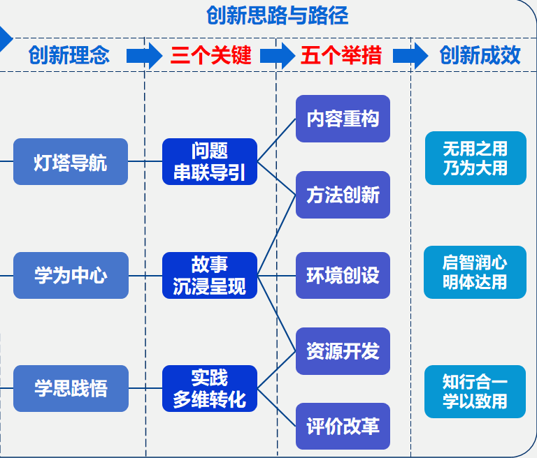 这门课的创新思路,立足我校以工科见长的人才培养目标和《思想道德与法治》课教学中的痛点问题,把握学生成长成才的规律特点,聚焦学生发展需要的关键要素。在这个基础上,坚持灯塔导航、践行“学为中心、学思践悟”的理念,通过问题串联导引、故事沉浸呈现、实践多维转化三个步骤,实现内容重构、方法优化、环境创设、资源开发和评价改革,目的就是让学生对我们的课程喜欢听、愿意学,有获得感,从而实现“无用之用乃为大用”、知行合一、学以致用的创新成效。