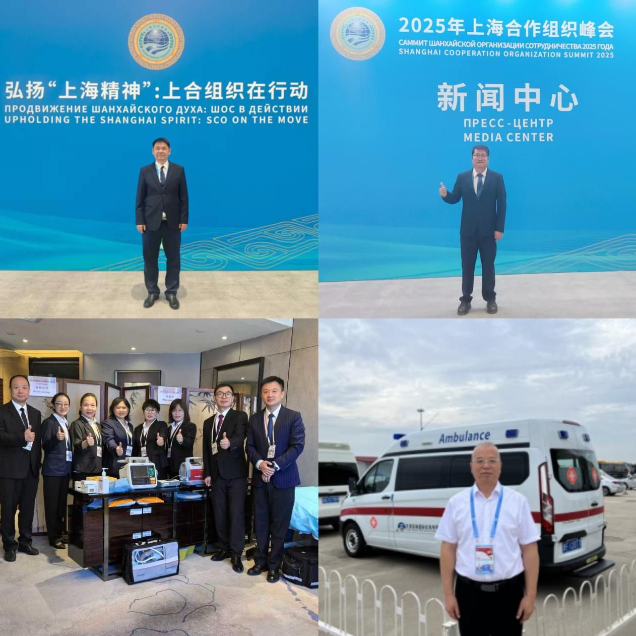 外国语学院参与峰会各工作组的志愿服务教师充分体现了天大人的严谨和求真务实精神。如翻译教育中心李鸿斌老师作为120医学紧急抢救组中的老同志,实战演习过程中不畏艰辛、吃苦耐劳,与同组医务人员密切沟通配合,并在交通站点外宾迎送的现场翻译工作中发挥重要作用。大英二部李彤老师在负责外宾医疗救助保障工作过程中,一方面及时有效地协助现场医护人员翻译常见疾病和急救药品名称,另一方面主动作为,充分利用信息化智能手段自行设计突发疾病急救场景,提前进行翻译演练,积累实战经验。大英一部姚健老师在志愿服务期间从事新闻中心展览展示组英文讲解工作,在带领外媒记者通过CAVE 8K沉浸式大屏体验上合组织国家的合作精神与文化魅力,以及天津市经济社会发展过程中,为中外媒体交流提供了出色的翻译服务。翻译中心殷世宇老师凭借出色的外语能力与跨文化沟通素养,带领外国语学院学生志愿服务团队提前进驻,与现场各点位工作人员协同配合,以高度的政治责任感和热情专业的服务圆满完成外媒记者证件发放与现场注册工作,充分展现天大外语人的专业风采。