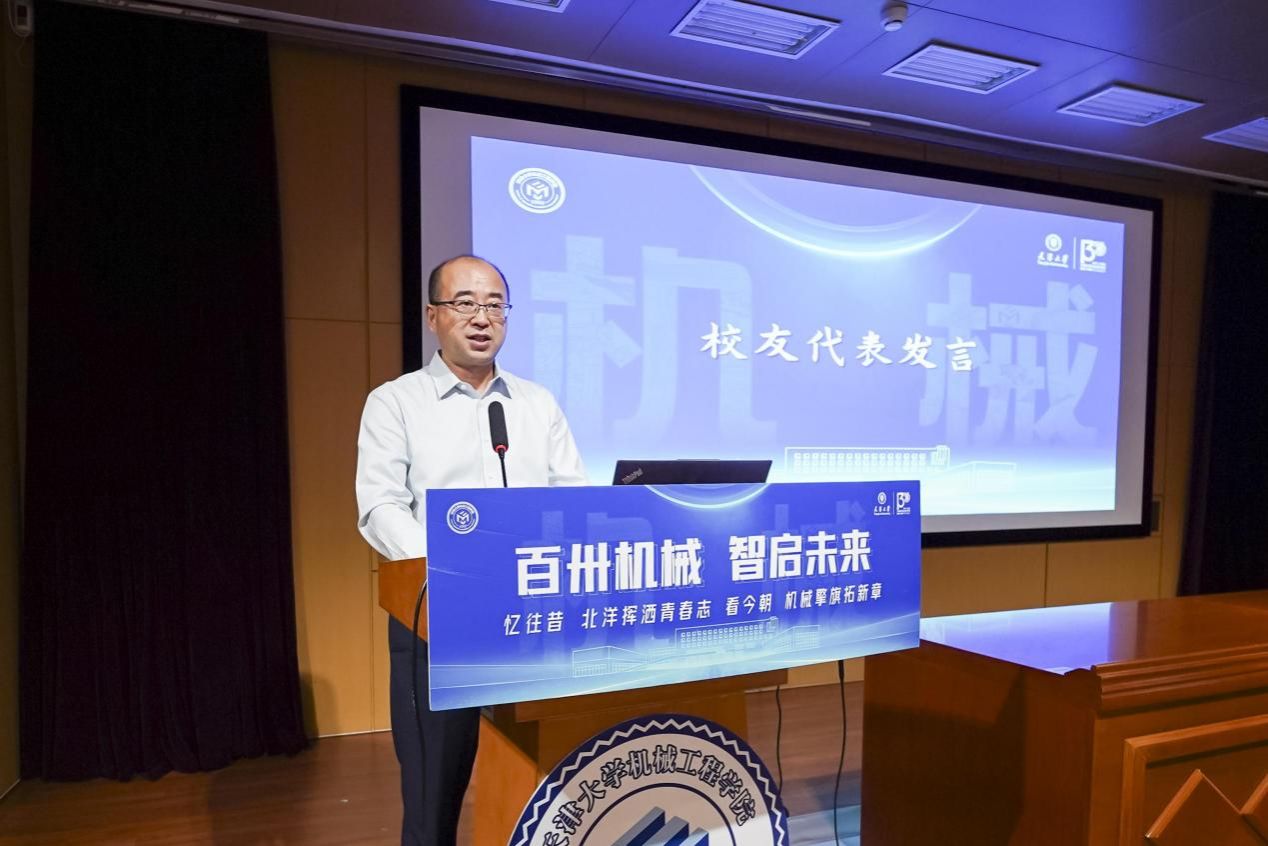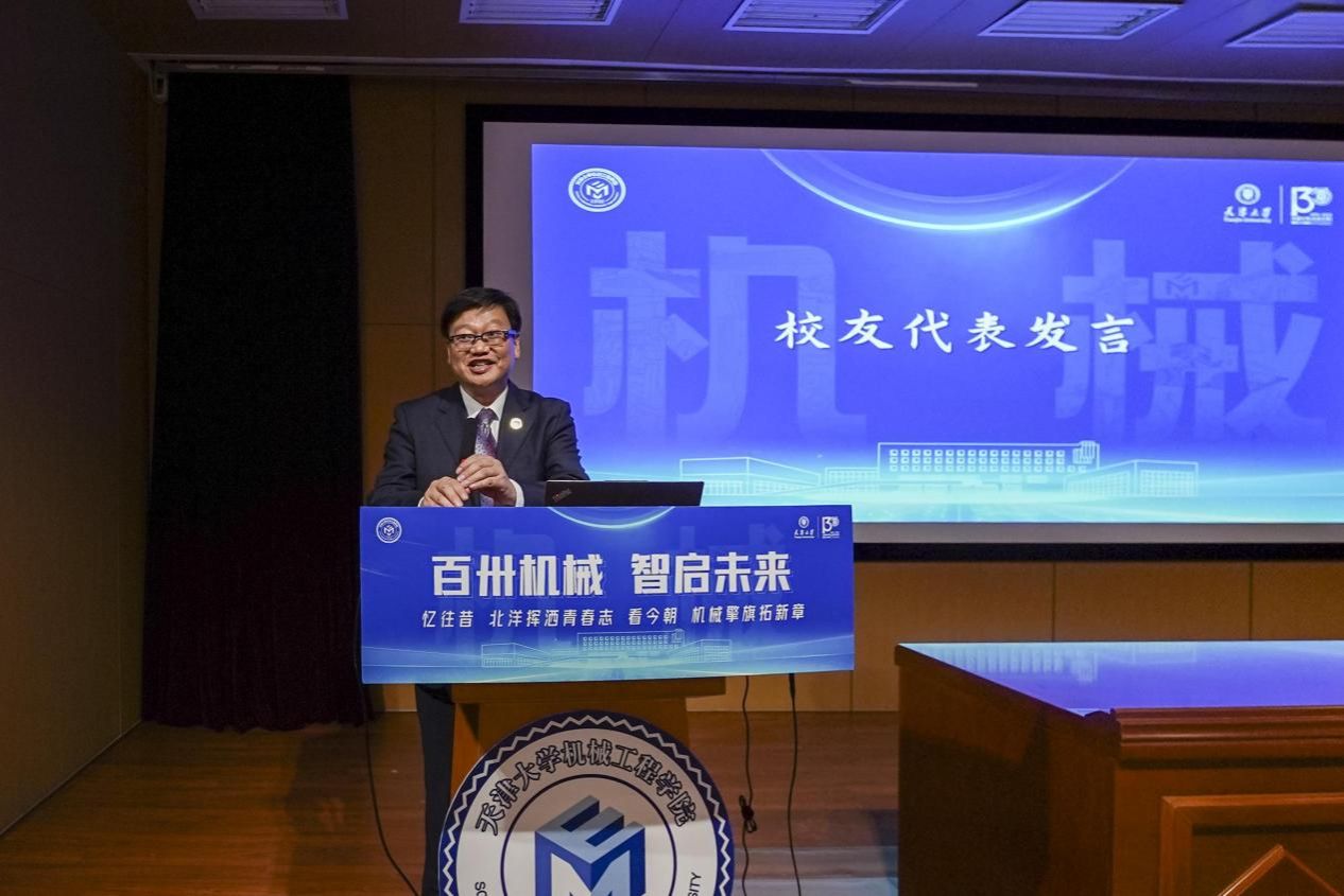 在校友代表发言环节,殷红春和林友忠两位校友分享了各自成长经历。2000届校友、新疆和田学院党委常委、副院长殷红春结合在校成长和在疆工作的经历,阐述了机械工程领域在服务边疆发展中的重要作用。1992届校友、三益(天津)精密机械股份有限公司董事长林友忠分享了求学和创业历程,表示在母校培养出的工程思维和创新意识让自己终身受益。