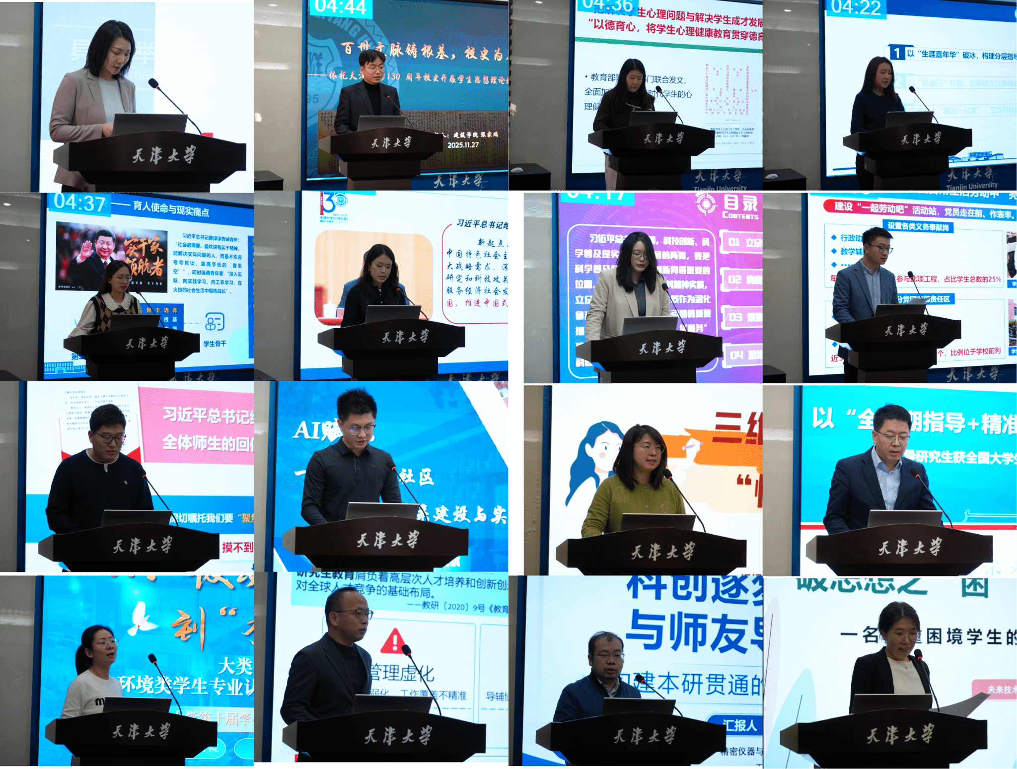 近日,天津大学第十届学生工作十佳集体和个人案例评选落下帷幕。天津大学青年发展研究中心建设委员会常务副主任、首席辅导员冯翠玲,党委统战部副部长、民主党派联合办公室主任刘涛,教务处副处长宋春风,研究生院院长助理梅坤荣担任集体案例终评的专家评委。天津师范大学党委学工部副部长许纯,第十一届全国高校辅导员年度人物提名奖获得者、教育部高校辅导员名师工作室主持人、天津医科大学基础医学院学工办主任郭琳,天津市十佳辅导员、首批天津市普通高校辅导员工作室主持人、天津财经大学商学院团委书记马建伟,天津市十佳辅导员、天津市普通高校辅导员工作室主持人、天津理工大学机械学院辅导员李君担任个人案例终评的专家评委。各学院(部)学生工作副书记、辅导员代表以及学工部、校团委机关辅导员代表参与、观摩集体案例和个人案例的终评展示。