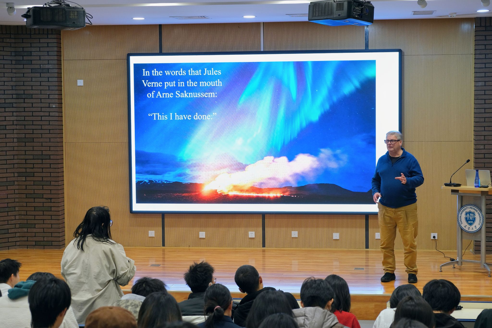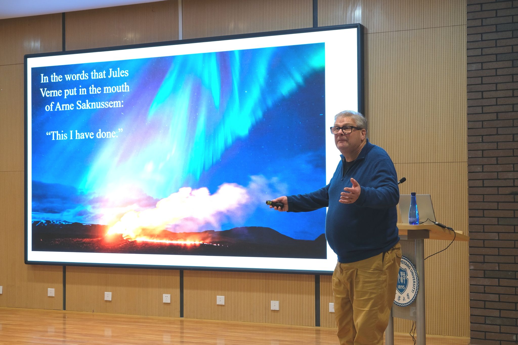 讲座伊始,Ellam教授以儒勒·凡尔纳的科幻小说《地心历险记》为切入点,将文学想象与现代科学研究巧妙连接,引发了现场观众对地球内部世界的浓厚兴趣。从小说中的冰岛火山口出发,他讲述了自己跨越四十余年、遍及五大洲的新利18网址登录