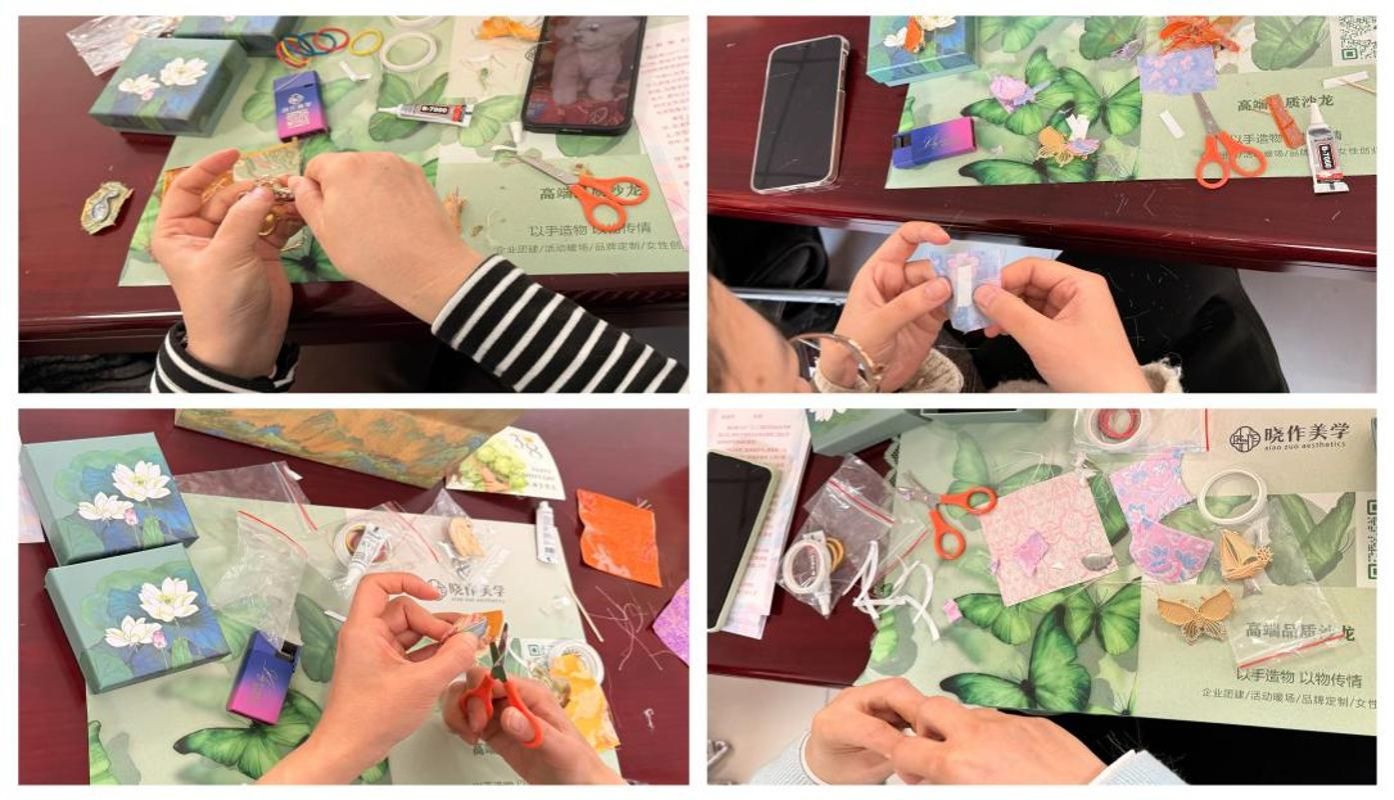 DIY制作环节中,女教职工们热情高涨、兴致盎然。在手工教师的细致指导下,大家纷纷化身“手作匠人”,从选料、裁剪到粘贴、组装,每一个步骤都一丝不苟。现场氛围温馨而热烈,大家一边专注创作,一边相互交流心得、分享创意,在欢声笑语间,一块块精美绝伦的宋锦面料,被巧妙制作成一枚枚独具匠心的胸针。女教职工们纷纷佩戴起自己的作品合影留念,锦缎流光与灿烂笑容交相辉映,定格下这个春日午后最美的画面。