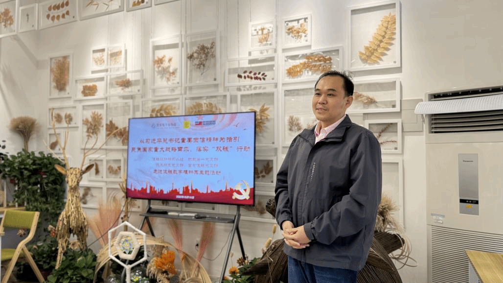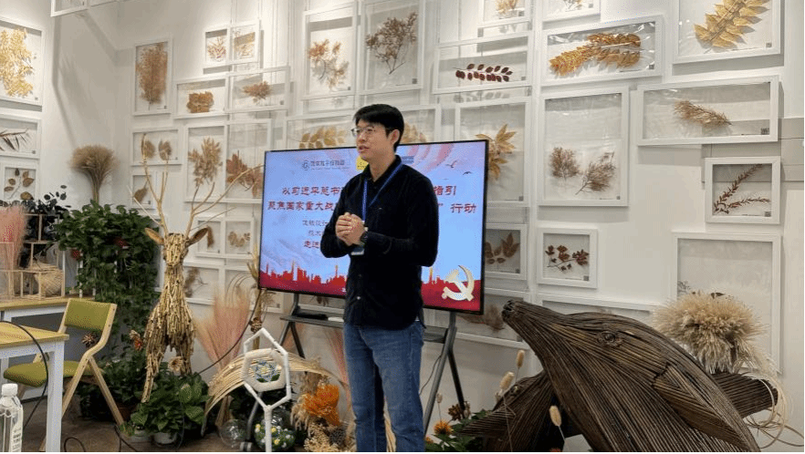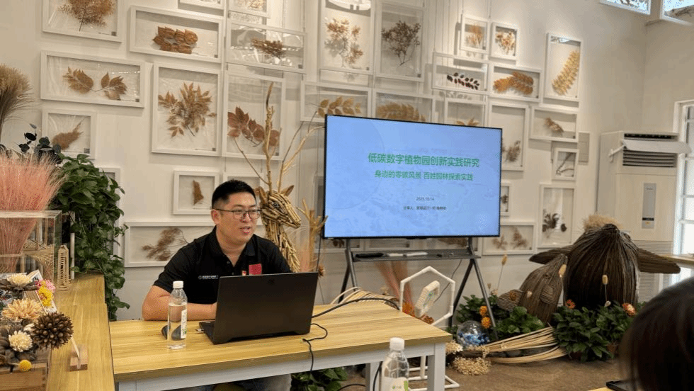 在低碳数字植物园展示中心,景观设计一所所长助理齐捷同志主持活动。全体党员系统了解了该园由王洪成教授团队于2023年创立的背景、理念及成效,深入认识这一集科普、研究、实践于一体的数字化平台。