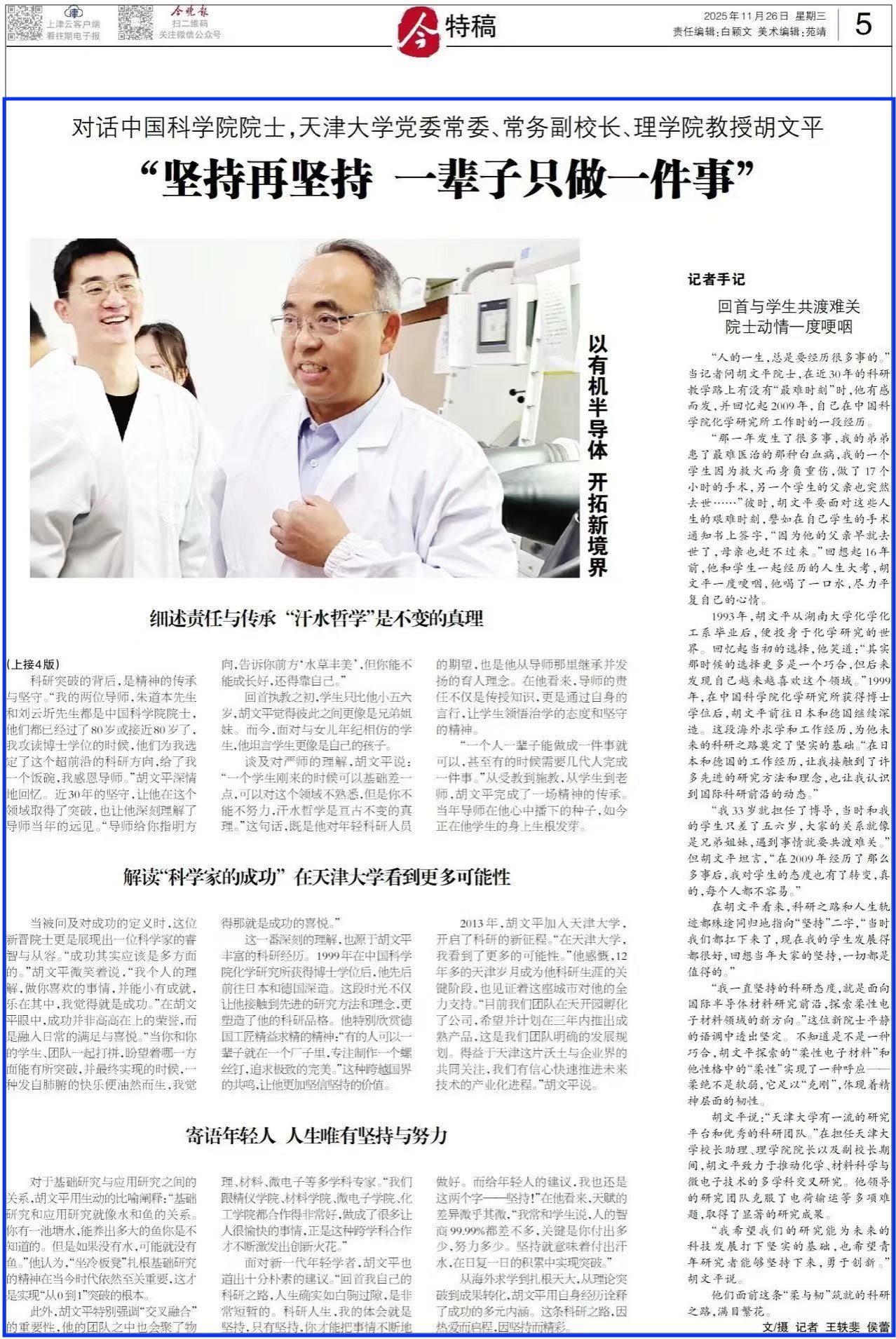 “我希望我们的研究能为未来的科技发展打下坚实的基础,也希望青年研究者能够坚持下来,勇于创新。”胡文平说。